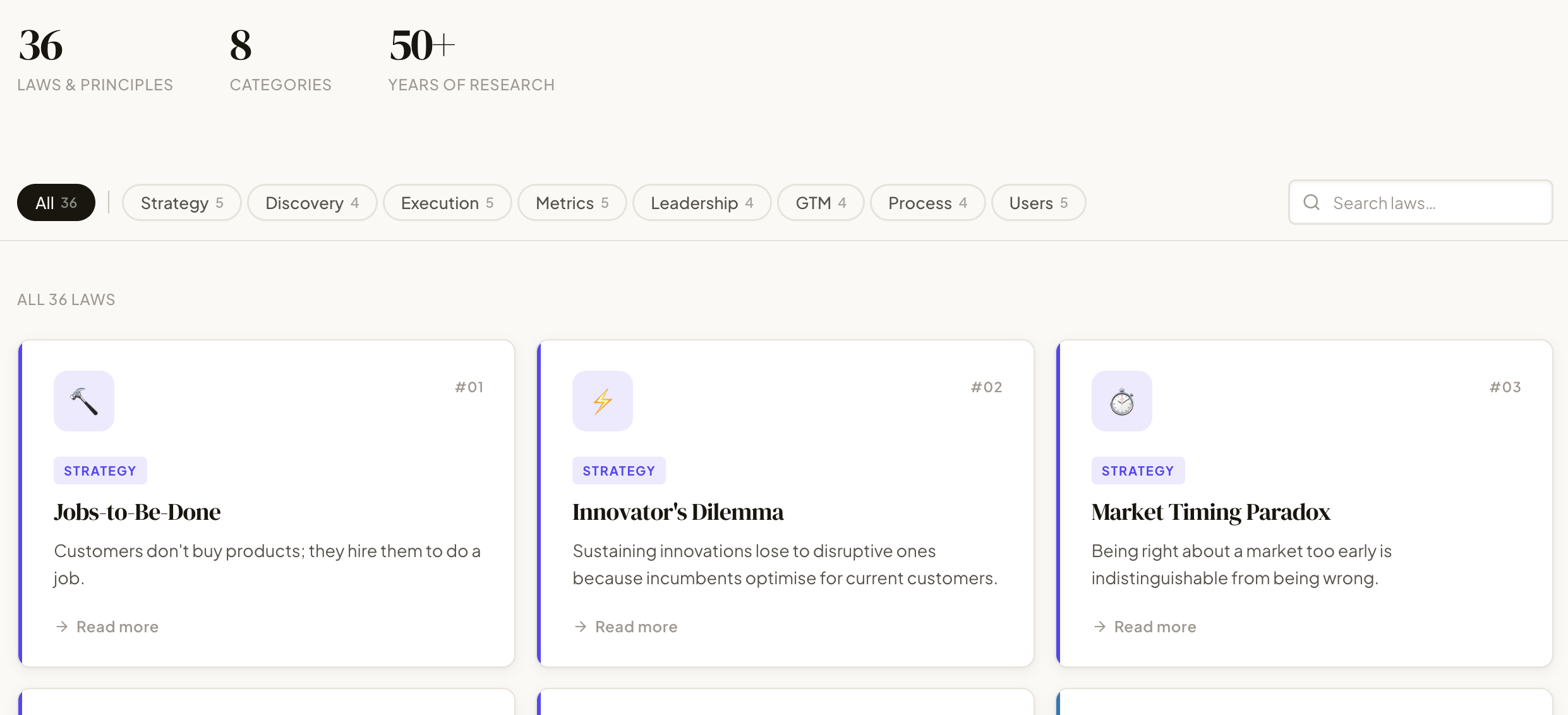 A reference site of product management laws, principles, and heuristics for discovering, building, and shipping great products.